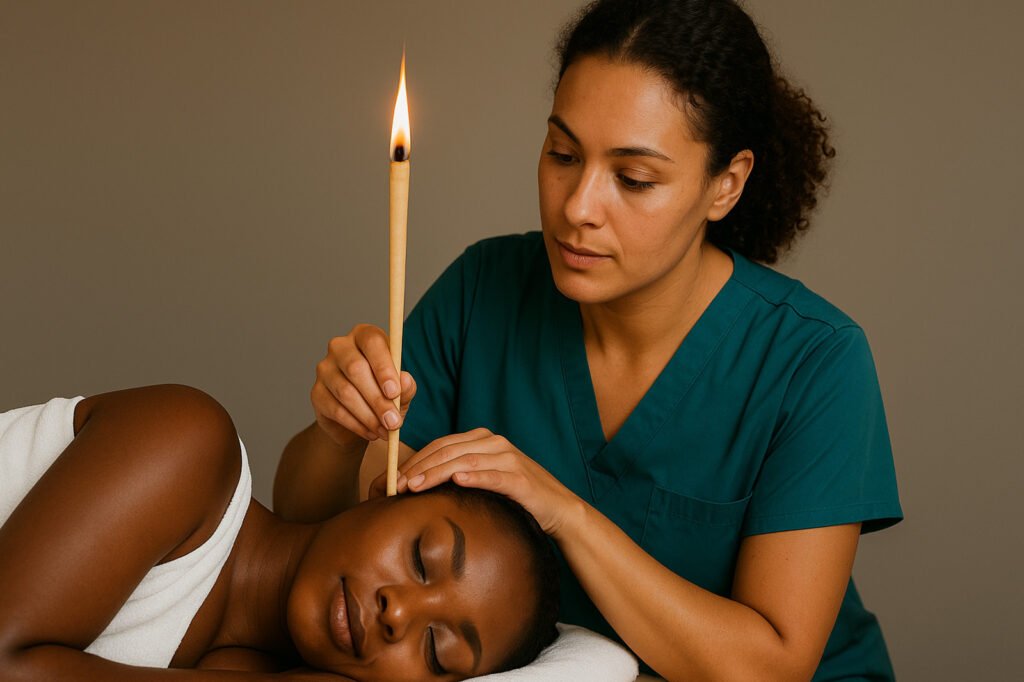A Cylinder made out of muslin cloth soaked in herbs is introduced into the ear and then lit. The change in temperature and pressure melts the ear wax and the wax is removed as it travels up the cylinder along with other debris that may be present due to the suction created.